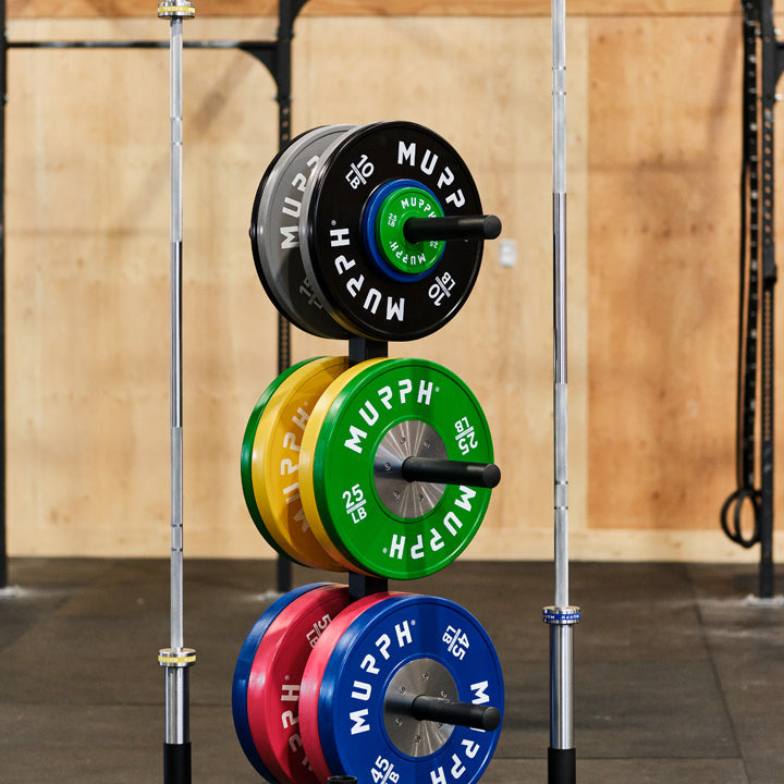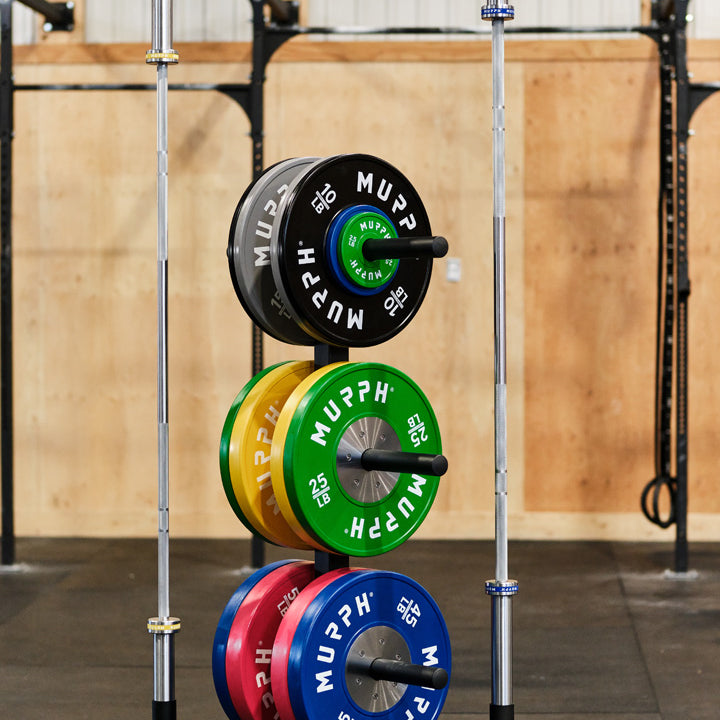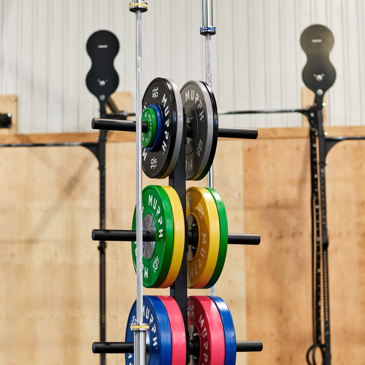 This MURPH Support Bumper Plate Tree and Bar Holder is precision-machined from solid steel for maximum sturdiness and strength. With its residential and commercial durability and capacity of 4 bars, this holder is ideal for training and competition plates.